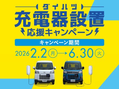 2月2日(月)から6月30日(火)の期間中に、e-ハイゼットカーゴ・e-アトレーご成約、およびご応募で、対象充電器本体+工事費を最大12万円サポート!