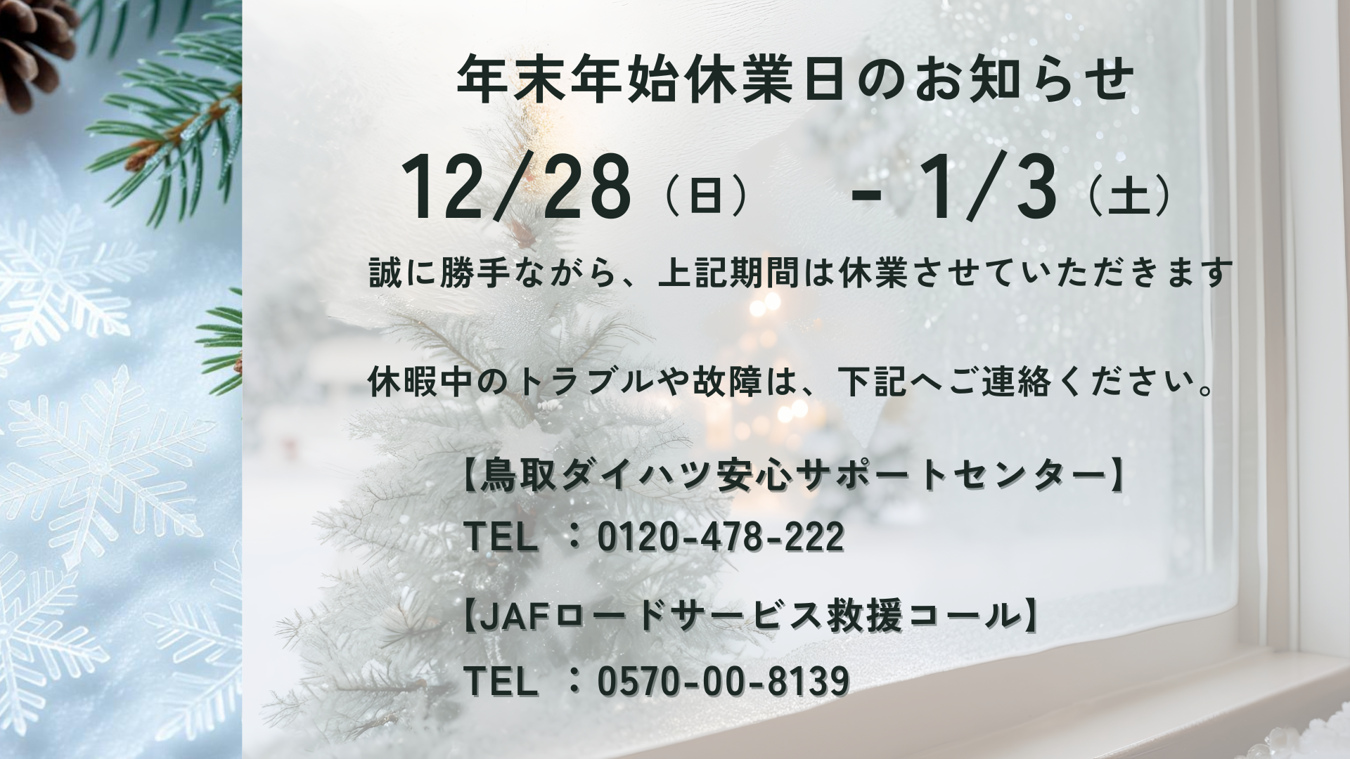 鳥取ダイハツでは、誠に勝手ながら12月28日(日)~1月3日(土)の期間長期休暇とさせていただきます。