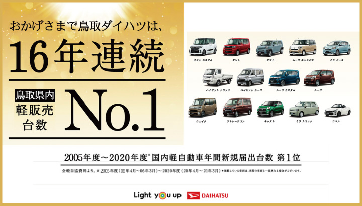 2021/04/11おかげさまで鳥取ダイハツは16年連続鳥取県内【軽販売台数No.1】となりました