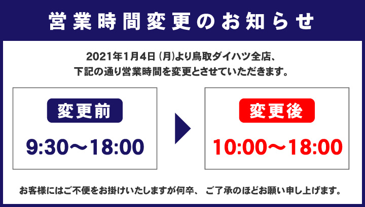 2020/12/09(終了)2021年1月4日(月)から営業時間変更のお知らせです