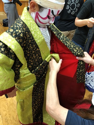 着付け中。地元のボランティアの方や、保護者の方と着させます。