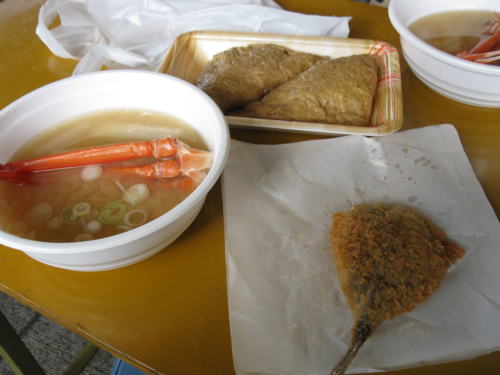 祭りでは、無料で「紅ズワイガニ」を貰えたり、カニ汁、イワシのつみれ汁、ハタハタ干物焼きが食べれます。