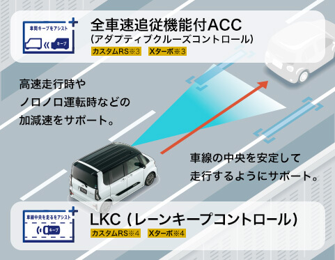 このスマアシにオプションとして設定できる便利な機能として、『全車速追従機能付きACC(アダプティブクルーズコントロール)』と『レーンキープコントロール(LKC)』