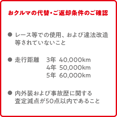 • 走行距離 3年 40,000km / 4年 50,000km / 5年 60,000km